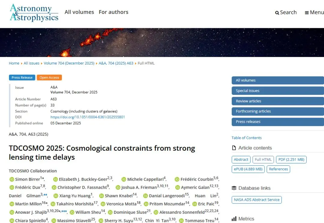 这一发现不仅是数据的偏差,更是一场物理学地震的前兆。这项由加州大学洛杉矶分校(UCLA)和 TDCOSMO 国际合作组主导的重磅研究,于2025年12月5日发表在天文学权威期刊《天文学与天体物理学》上 。科学家们并未像往常一样欢呼“验证了爱因斯坦的理论”,而是面色凝重地告诉世界:宇宙的膨胀速度,比我们预想的要快,而且这一次,我们找不到借口了 。